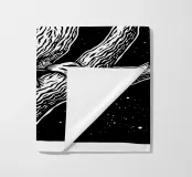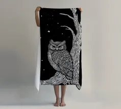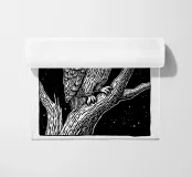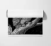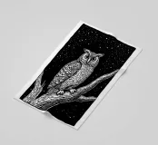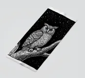 Una suggestiva illustrazione in bianco e nero in stile linoleografia di un gufo appollaiato su un albero sotto un cielo notturno stellato. Gli intricati dettagli delle piume del gufo e della corteccia dell'albero creano un contrasto ipnotico con lo sfondo scuro, evocando un senso di mistero e saggezza.