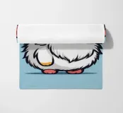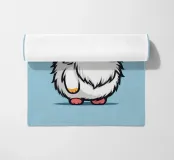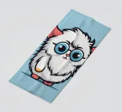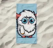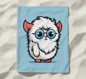 Un'affascinante creatura di peluche si erge in piedi con occhiali blu oversize, mostrando una miscela di elementi giocosi e design stravaganti, su uno sfondo azzurro morbido.