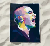 Un ritratto vibrante e geometrico di Sinead O'Connor in stile WPAP, caratterizzato da forme audaci e angolari e da un'impressionante gamma di colori vivaci e contrastanti. L'opera cattura i suoi tratti iconici, come la testa rasata, gli occhi penetranti e la forte espressione facciale, utilizzando blocchi di colore nitidi e frammentati. La composizione enfatizza la profondità e l'emozione mantenendo l'estetica pop-art cubista distintiva di WPAP, creando un tributo visivamente dinamico e moderno alla leggendaria cantante.