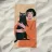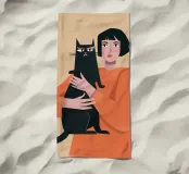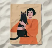 Una persona che indossa un vivace top arancione tiene vicino un elegante gatto nero, i loro sguardi sono allineati, evidenziando il forte legame tra l'uomo e l'animale domestico su uno sfondo semplice e dai toni caldi.