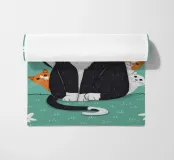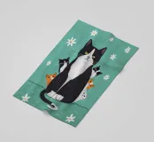 Una simpatica e stravagante illustrazione di un gatto tuxedo con le zampe alzate in segno di resa o di gioia, circondato da fiocchi di neve che cadono su uno sfondo verde scuro.