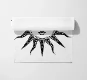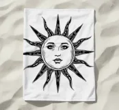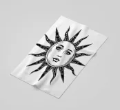 Un'ipnotica illustrazione in bianco e nero di un sole radioso dal volto umano. Gli occhi espressivi e le labbra delicate del sole gli conferiscono una presenza mistica e celestiale, mentre i suoi raggi strutturati si estendono verso l'esterno in un disegno organico e fluente. L'opera fonde simbolismo e natura, evocando temi di calore, energia e armonia cosmica.