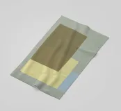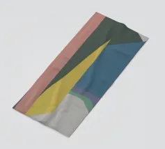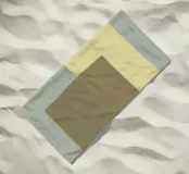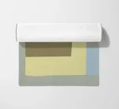 Diverse forme geometriche dai colori tenui sono sovrapposte a uno sfondo chiaro. Un rettangolo color oliva opaco domina una parte della tela, sovrapponendosi parzialmente a una forma giallo pallido, con un accenno di blu che fa capolino da sotto.