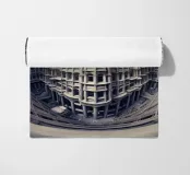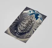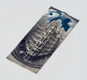 Una prospettiva fisheye surreale che mostra una torreggiante architettura gotica futuristica con dettagli intricati e motivi simmetrici, sullo sfondo di un cielo blu vibrante con nuvole drammatiche. L'immagine evoca la modernità mescolata a elementi di design classico.