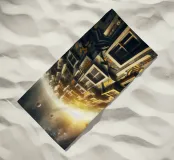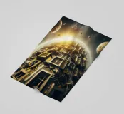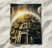 Una struttura architettonica futuristica simile a un pianeta, con intricate facciate geometriche e motivi luminosi, circondata da oggetti sferici orbitanti sotto un cielo cosmico, illuminato da una radiosa luce celeste. L'immagine combina l'immaginazione fantascientifica con la creatività architettonica.