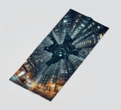 Una surreale visione fisheye di strutture urbane torreggianti con dettagli intricati e modelli simmetrici, che convergono verso un cielo radioso. Il design architettonico stratificato evidenzia l'innovazione moderna e la creatività artistica.
