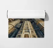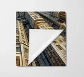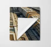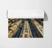 Una surreale visione fisheye di strutture urbane torreggianti con dettagli intricati e modelli simmetrici, che convergono verso un cielo radioso. Il design architettonico stratificato evidenzia l'innovazione moderna e la creatività artistica.