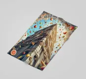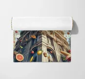 Una stravagante rappresentazione di un edificio storico con dettagli intricati circondato da un cielo vibrante pieno di frutta e verdura galleggianti. La composizione surreale fonde architettura e fantasia per una visione creativa e colorata.