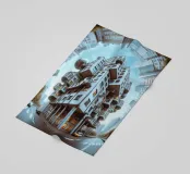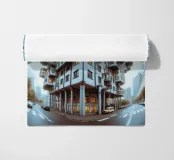 Un sorprendente edificio modulare con elementi futuristici, tubi e strutture sferiche, circondato da un paesaggio urbano distorto. La composizione fantasiosa fonde l'architettura moderna con il surrealismo, creando una prospettiva unica e dinamica.