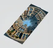 Questa immagine presenta una surreale disposizione circolare di edifici in mattoni con portali ad arco, finestre intricate e un cielo blu brillante al centro. Il design coinvolgente crea un'illusione ottica di simmetria architettonica infinita.