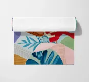 Una composizione astratta costruita con forme stratificate che suggeriscono foglie e motivi tessili, in una sofisticata tavolozza di blu, terracotta, beige, bianco e un sottile accenno di rosso.