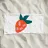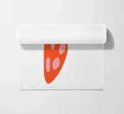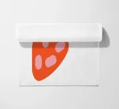 La rappresentazione stilizzata e semplicistica di una fragola presenta un corpo arancione con tre semi rosa e foglie verde scuro. Il design minimalista utilizza colori e forme audaci per evocare un'atmosfera giocosa e moderna.