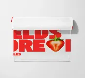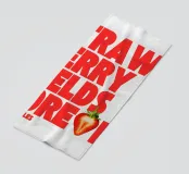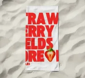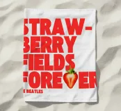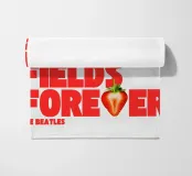 "Le parole 'Strawberry Fields Forever' sono impilate verticalmente in caratteri rossi su uno sfondo chiaro, con una fragola a fette che sostituisce lo '0' di 'Forever', creando un'atmosfera stravagante e nostalgica",