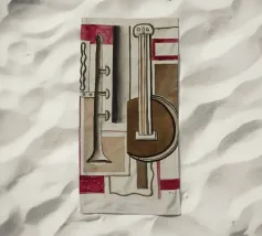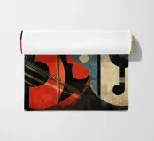 Un moderno dipinto astratto con forme geometriche che formano chitarre, violini e note musicali in una composizione audace e colorata. Lo sfondo strutturato e la disposizione dinamica evocano un senso di ritmo e di espressione artistica.