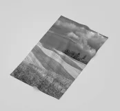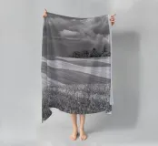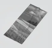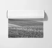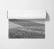 Black and white images of a harvested field. The geometric structure contrasts with the clouds.