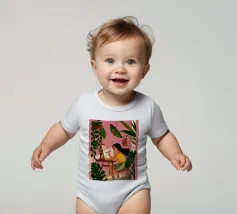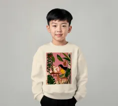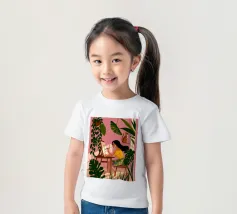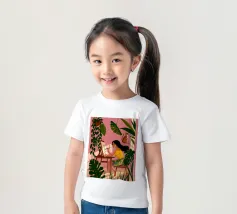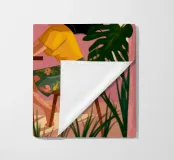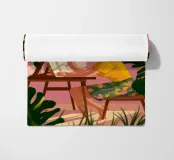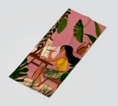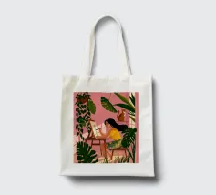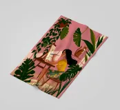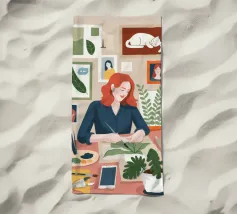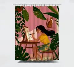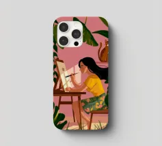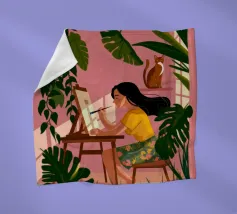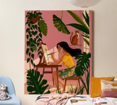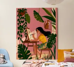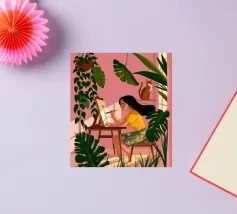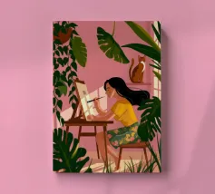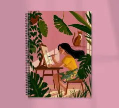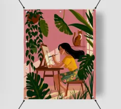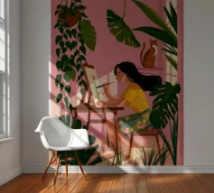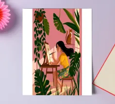 Una persona è seduta a una scrivania, mentre disegna o scrive, circondata da piante rigogliose. L'ambiente è artistico e pieno di verde.