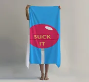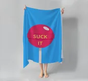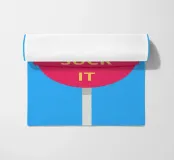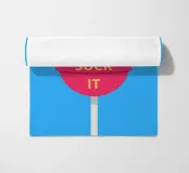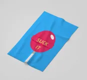 Un lecca-lecca rosa con la scritta "SUCK IT" in lettere gialle. La superficie lucida della caramella aggiunge un tocco giocoso al disegno.