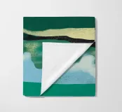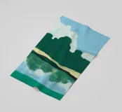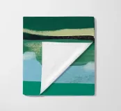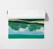 Verdi colline si contrappongono a un cielo pieno di soffici nuvole bianche, mentre in basso il loro riflesso si specchia sull'acqua increspata. L'immagine utilizza una tavolozza di colori semplici e forme astratte per evocare una scena di paesaggio sereno.