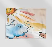 Un cane incoronato guarda verso l'alto una nuvola sorridente e un sole radioso. L'ambientazione immaginaria evoca un senso di fantasia, di festa e di calore sotto i raggi luminosi.