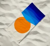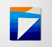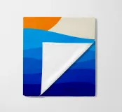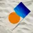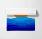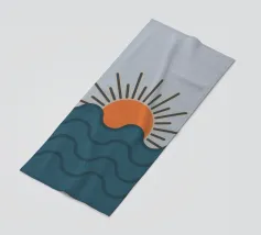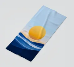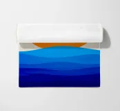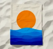 Un grande sole arancione tramonta o sorge sopra una serie di strati blu ondulati che rappresentano l'oceano. Lo sfondo è di colore beige chiaro e crea una scena tranquilla e minimalista.