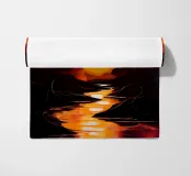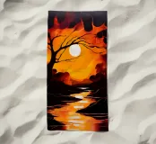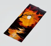 Questo vibrante dipinto astratto cattura l'essenza di un tramonto infuocato. Un albero solitario si staglia contro il cielo infuocato, i suoi rami si protendono verso la luna luminosa. I riflessi nell'acqua creano un gioco ipnotico di luci e ombre.