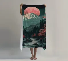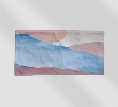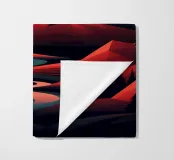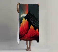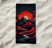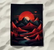 Questo paesaggio geometrico mostra un drammatico tramonto che proietta un caldo bagliore su una maestosa catena montuosa. Lo stile minimalista enfatizza le forme audaci e i colori vivaci, creando un pezzo moderno e di grande impatto visivo. Il fiume sinuoso aggiunge un senso di profondità e dinamismo alla composizione.