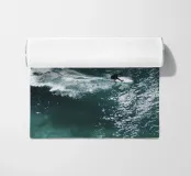 A surfer rides the rolling waves with balance and grace, standing firmly on the board as the ocean’s energy carries them forward, embodying both freedom and adventure.