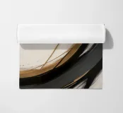 I tratti curvilinei marroni e neri attraversano lo spazio crema in eleganti archi di movimento.