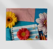 Un taccuino a righe con fiori vivaci si trova su uno sfondo blu e rosa, accompagnato da matite colorate e da una matita arancione, per creare un'area di lavoro allegra.