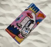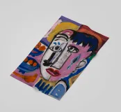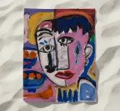 Questa opera d'arte mostra un volto con una lacrima e un mix di colori. Lo sfondo comprende forme e motivi astratti, che aggiungono profondità emotiva al dipinto.