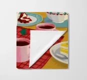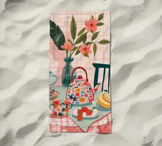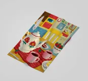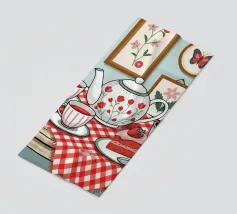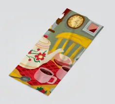 Un accogliente tavolo da cucina, apparecchiato con teiere di ciliegio e dolciumi, risplende nei caldi colori giallo e rosso.