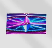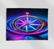 Illustration of a compass on a black background with a pink and blue wind rose and an arrow pointing to north.