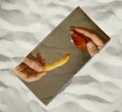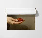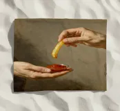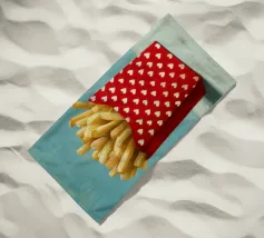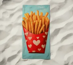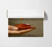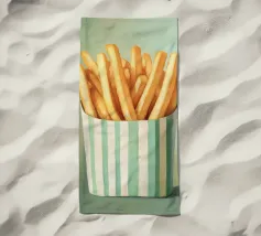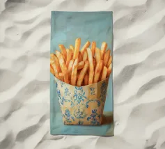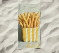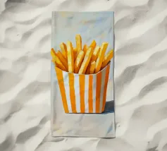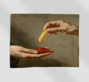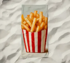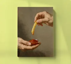 Una spiritosa parodia ispirata alla pittura rinascimentale, in cui una singola patatina fritta dorata si protende verso una ciotola di ricco ketchup.