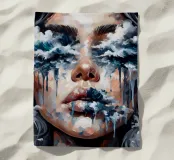 Portrait painting of a woman with waves crashing over her face.