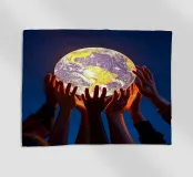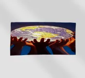 Un gruppo di persone sostiene idealmente la terra per salvarla dalla deriva.