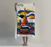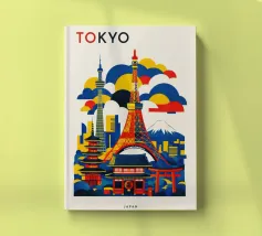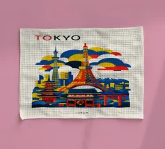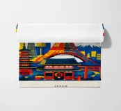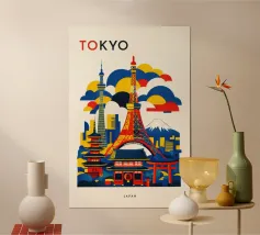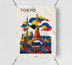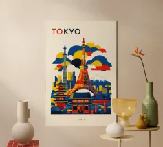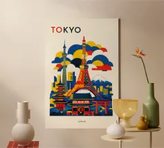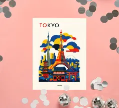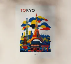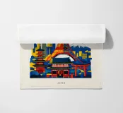 A bold, graphic celebration of Tokyo, where tradition and modernity meet through clean geometry and confident colour blocking. Iconic city landmarks are layered into a dynamic skyline, balancing historic forms with contemporary structures to reflect Tokyo’s unique rhythm and scale. The composition feels energetic yet ordered, capturing the city’s intensity without visual clutter.
