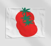 Una rappresentazione semplice e stilizzata di un pomodoro è raffigurata con colori rossi e verdi. Il pomodoro è arrotondato e presenta foglie verdi nella parte superiore.