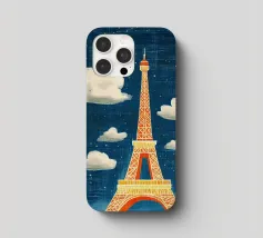 L'immagine mostra la Torre Eiffel in un cielo notturno di un blu intenso, con nuvole bianche, stelle scintillanti e una mezzaluna arancione. La torre stessa risplende nei toni caldi del giallo e dell'arancione e si staglia radiosa sullo sfondo scuro. Lo stile è chiaramente illustrativo e artistico, un misto di romanticismo sognante e colorazione espressiva. Ricorda un dipinto o un poster digitale che enfatizza l'atmosfera e lo stato d'animo piuttosto che la precisione realistica. Un gioco visivamente affascinante tra fantasia e punto di riferimento.