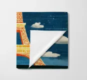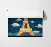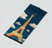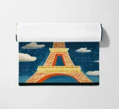 L'immagine mostra la Torre Eiffel in un cielo notturno di un blu intenso, con nuvole bianche, stelle scintillanti e una mezzaluna arancione. La torre stessa risplende nei toni caldi del giallo e dell'arancione e si staglia radiosa sullo sfondo scuro. Lo stile è chiaramente illustrativo e artistico, un misto di romanticismo sognante e colorazione espressiva. Ricorda un dipinto o un poster digitale che enfatizza l'atmosfera e lo stato d'animo piuttosto che la precisione realistica. Un gioco visivamente affascinante tra fantasia e punto di riferimento.