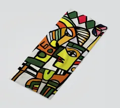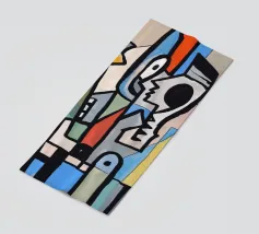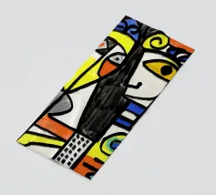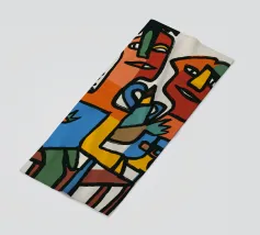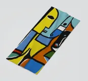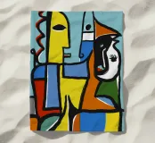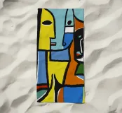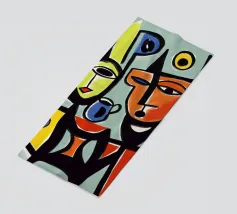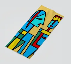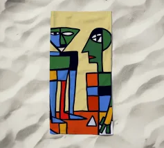 Due figure stilizzate dominano la composizione, caratterizzate da forme astratte e colori vivaci. Una figura appare di profilo mentre l'altra è rivolta in avanti, entrambe con tratti esagerati e una qualità stravagante.