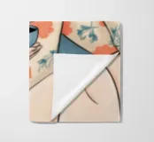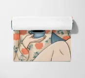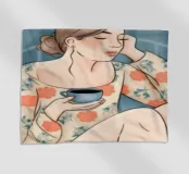 Il dipinto raffigura una persona seduta comodamente, con in mano una tazza di tè. L'abbigliamento a motivi floreali e l'espressione calma trasmettono un senso di tranquillità e relax.