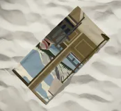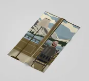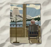 Un dipinto sereno e realistico cattura la vista da una stanza accogliente, con una poltrona e una lampada in primo piano, che si affaccia da una grande finestra su un lago tranquillo e sulle montagne innevate.
