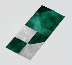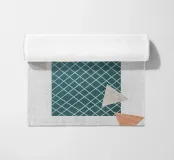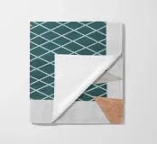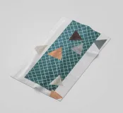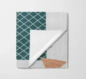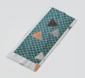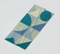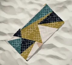 Le forme geometriche sono disposte su uno sfondo strutturato, caratterizzato da un motivo a griglia verde acqua. I triangoli di varie tonalità creano un contrasto visivo dinamico.