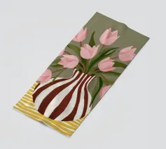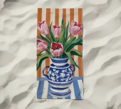 Tulipani rossi e rosa sono elegantemente esposti in una brocca bianca decorata con motivi di foglie verdi. La brocca poggia su una superficie a strisce bianche e blu, su uno sfondo scuro, creando un look classico e raffinato.