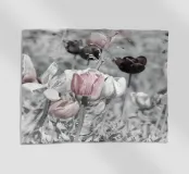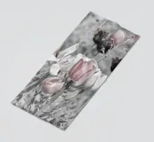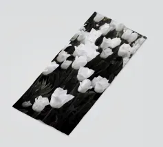 Delicati tulipani rosa, bianchi e rosso scuro su un prato chiaro e morbido.
