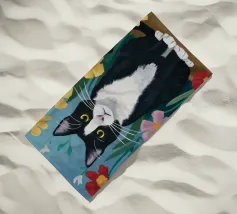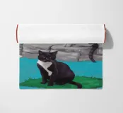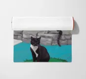 Un'affascinante raffigurazione di un gatto bianco e nero, probabilmente un gatto Tuxedo, seduto serenamente su un muro o un gradino di pietra danneggiato dalle intemperie. Il morbido fogliame verde e i delicati fiori rossi fanno da sfondo alla natura.
