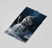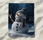 Un pupazzo di neve adornato con un cappello e una sciarpa si gode la serena bellezza di una foresta innevata al chiaro di luna, circondato da fiocchi di neve che cadono.