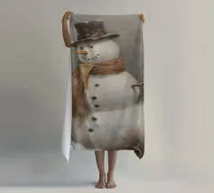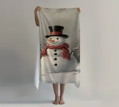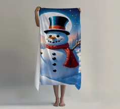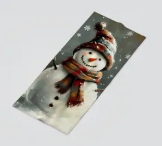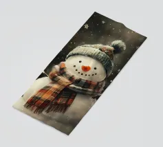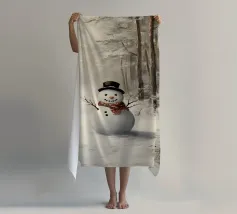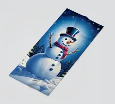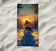Un pupazzo di neve, con tanto di cappello a cilindro e sciarpa, saluta la sera d'inverno in una foresta serena. I fiocchi di neve cadono delicatamente intorno, creando un'atmosfera magica.