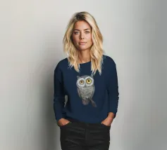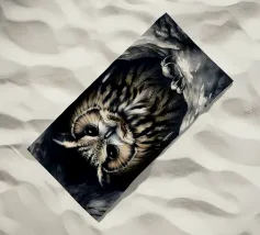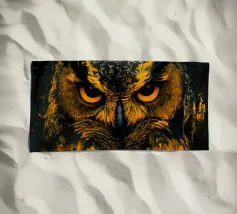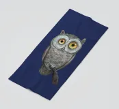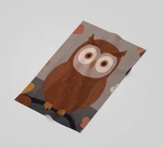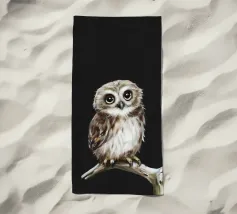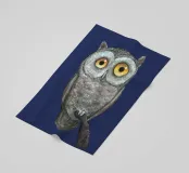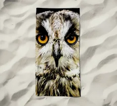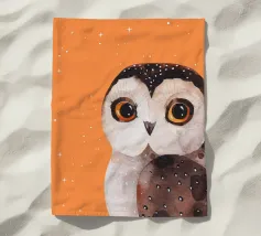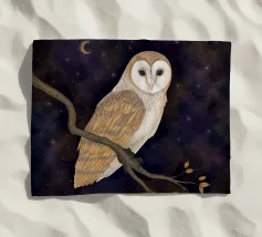 Un dipinto a olio di un gufo dall'aspetto simpatico e divertente. Si tratta di un uccello marrone chiaro con grandi occhi arancioni. Gli occhi del gufo sono un po' irregolari, il che lo fa sembrare ancora più buffo e dolce. Sembra anche un po' spaventato con i suoi occhi rotondi.