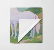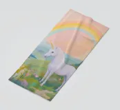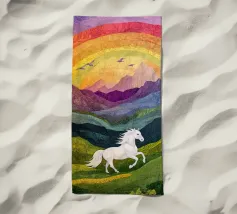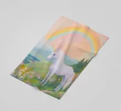 Un dolce unicorno in piedi davanti a dolci colline e a un luminoso cielo arcobaleno: questo disegno cattura il fascino della fantasia e la meraviglia dell'infanzia. Perfetto per le camerette, le stanze dei giochi o per chiunque ami la tranquilla magia dei paesaggi mitici.